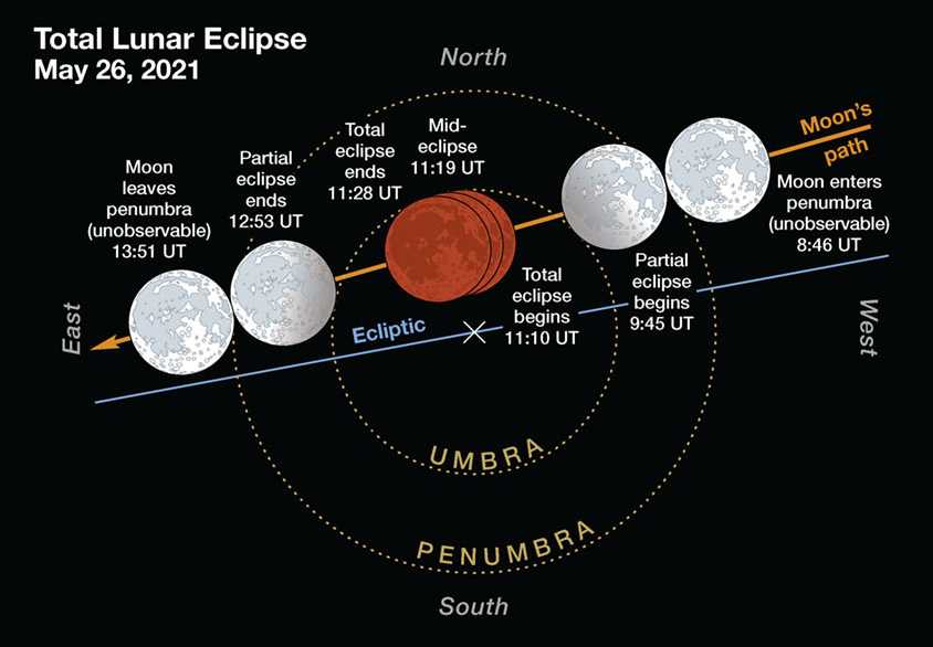 Точное время затмения — 26 мая в 15:52 по Московскому и Киевскому времени. На территории европейской части России, Украины, Беларуси и вообще Европы наблюдаться затмение не будет, так как Луна в это время будет находиться ниже линии горизонта. Однако, после того как Луна взойдет над горизонтом, а произойдет это 26 мая 2021 года в 21:10 по московскому времени, мы сможем наблюдать на небосводе огромный диск ночного светила красноватого цвета.