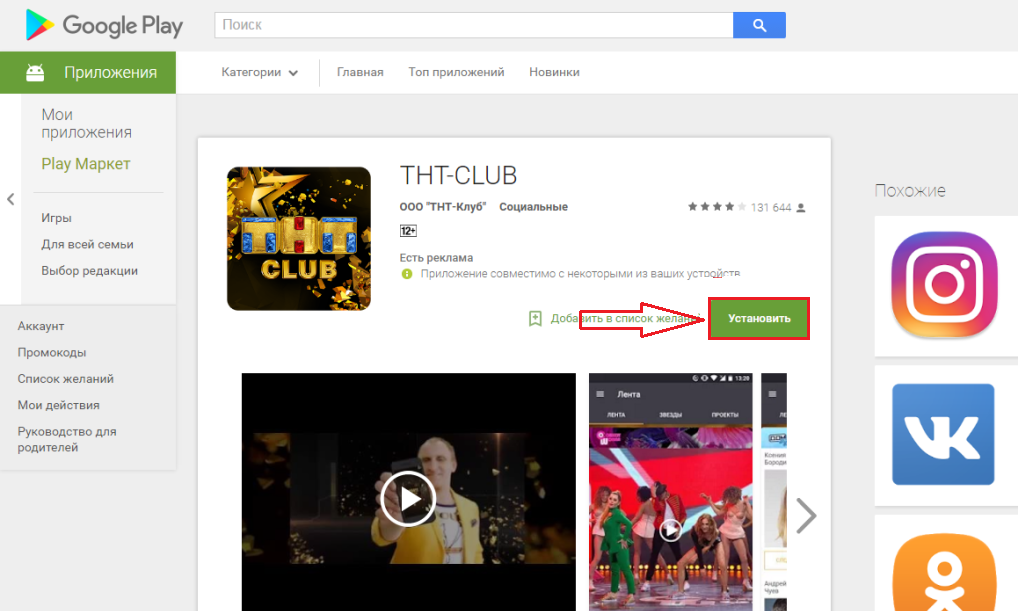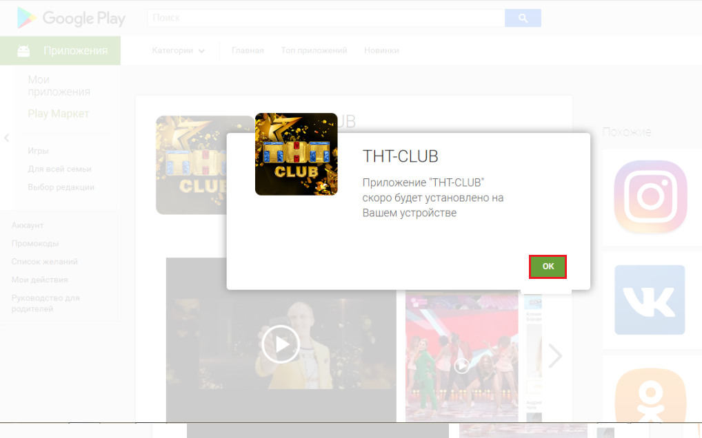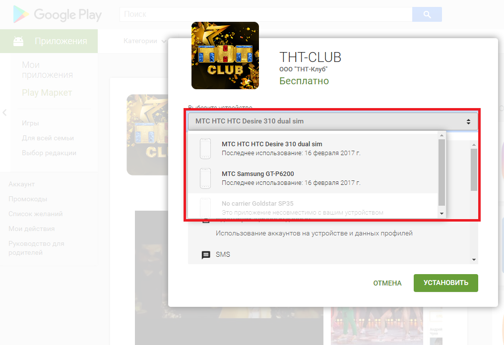 Если Вы используете свою учетную запись на нескольких устройствах, то в том же самом маленьком окошке в верхней графе Вам необходимо выбрать смартфон или планшет, на который Вы хотите установить приложение «ТНТ-Club», после чего кликните по кнопке «Установить» для начала загрузки приложения.