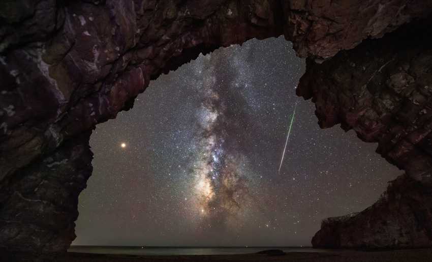 Метеор из потока Персеиды, сфотографированный на фоне планеты Марс и Млечного Пути. Снимок сделан в 2018 году в Алгарве, Португалия. Фото: Sebastian Voltmer