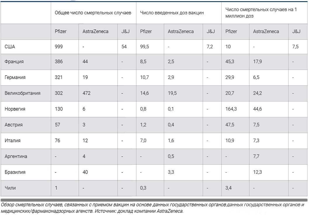 Согласно исследованию, почти во всех странах, где проводились исследования, вакцина Pfizer вызывала больше смертей из расчёта на один миллион доз, чем те же препараты от AstraZeneca и Johnson & Johnson. Например, во Франции данный показатель составляет 45,3 случая у американской компании и 17,9 — у британского производителя. В других европейских странах следующее соотношение: в Германии вакцина Pfizer вызвала 29,9 смерти на миллион доз, а вакцина AstraZenaca — 6,5; в Норвегии летальных исходов — 164,3 и 44,6 соответственно; в Австрии — 47,5 и 7,5; в Италии — 10,9 и 7,3. При этом вакцина AstraZeneca вызвала больше смертельных случаев в условно «родной» Великобритании, где компания, собственно, зарегистрирована: там препарат причинил 24,2 смерти на миллион доз, а Pfizer — 20,7.