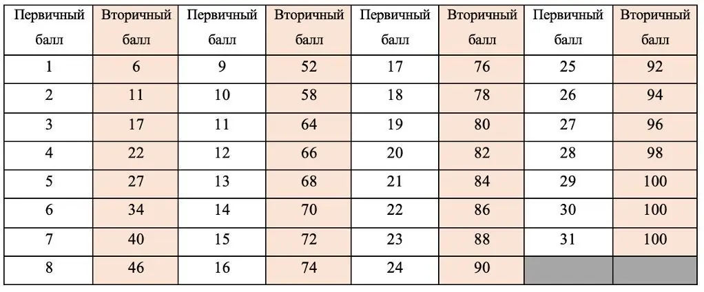 “Ну вот получил я, например, 28, а во вторичных-то это сколько?” — обязательно спросите вы. И мы ответим. Для перевода во вторичную систему существует специально разработанная таблица, ориентироваться в которой предельно просто. Ищем количество набранных баллов в первом столбике и смотрим их перевод во втором. Вуаля, вот и ваш результат!