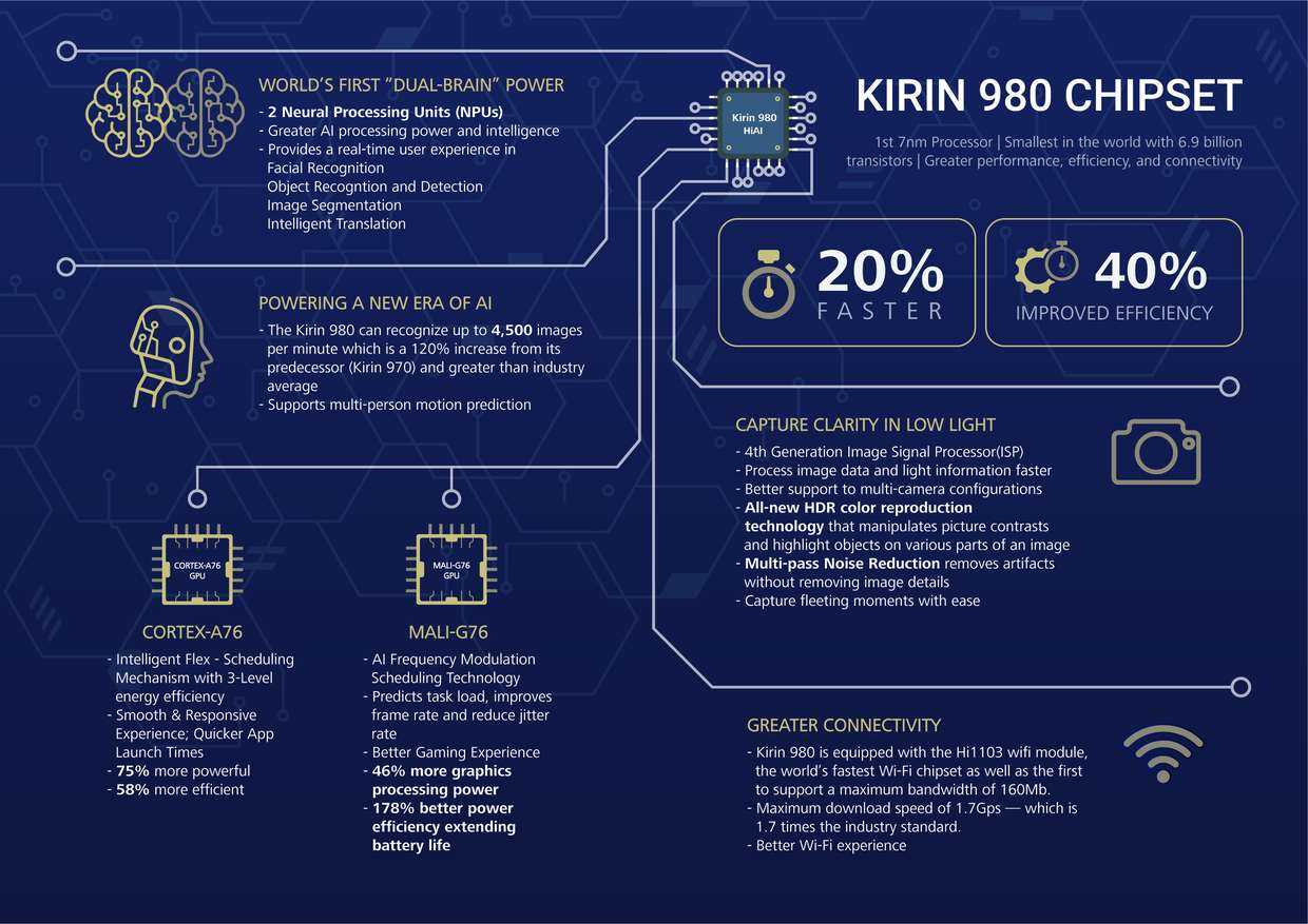 - процессор HUAWEI Kirin 980 (7 нм, 2 ядра Enyo 2,5 ГГц + 2х Enyo 2,0 ГГц + 4х Ananke 1,8 ГГц)