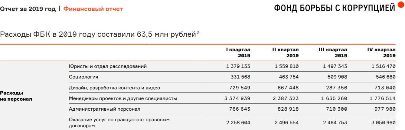 Среднее значение его зачислений — примерно 540 тыс. рублей. Но варьируются они от 900 рублей до 1 млн. Даже если предположить, что Замятин отдавал фирме собственную зарплату (которая, кстати, формируется из пожертвований), очевидно, что в фонде он столько не зарабатывал. Согласно отчёту ФБК, все расходы фонда по статье «Юристы и отдел расследований» составили примерно 6 млн рублей.
