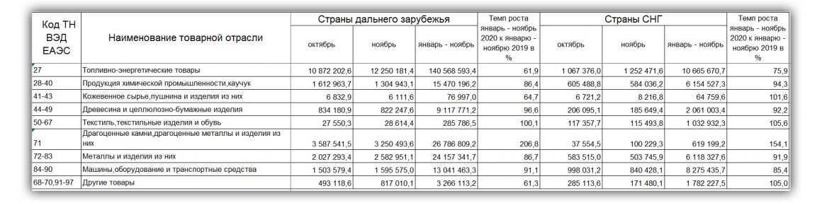Структура российского экспорта (ноябрь-январь 2020 года). Как мы видим, лидирующая статья экспорта (более 60%) — это углеводороды. Таблица основана на данных Федеральной таможенной службы.