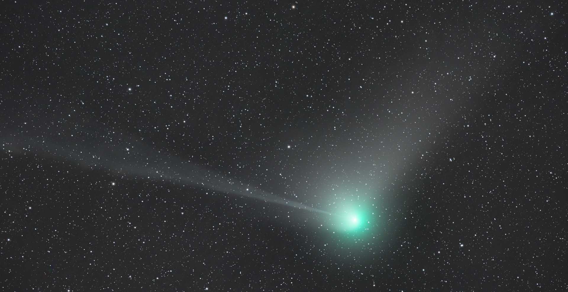 «Зеленая» комета C/2022 E3 (ZTF) и ее длинный ионный хвост. Снимок получен 31 января 2023 года в Испании. Фото: Soumyadeep Mukherjee