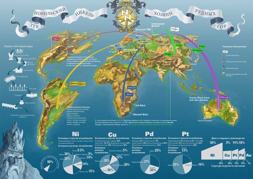 Норильский никель имеет собственную глобальную сеть представительских и сбытовых офисов в России, Великобритании, Китае, США и Швейцарии.