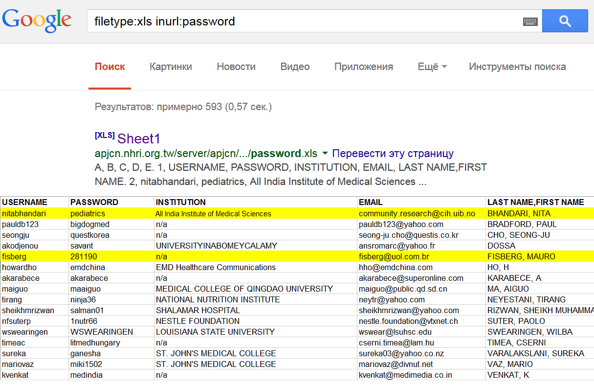 Иногда добраться до закрытой информации удается с помощью случайно открытых и попавших в поле зрения Google данных. Идеальный вариант — найти список паролей в каком-нибудь распространенном формате. Хранить сведения аккаунтов в текстовом файле, документе Word или электронной таблице Excel могут только отчаянные люди, но как раз их всегда хватает.