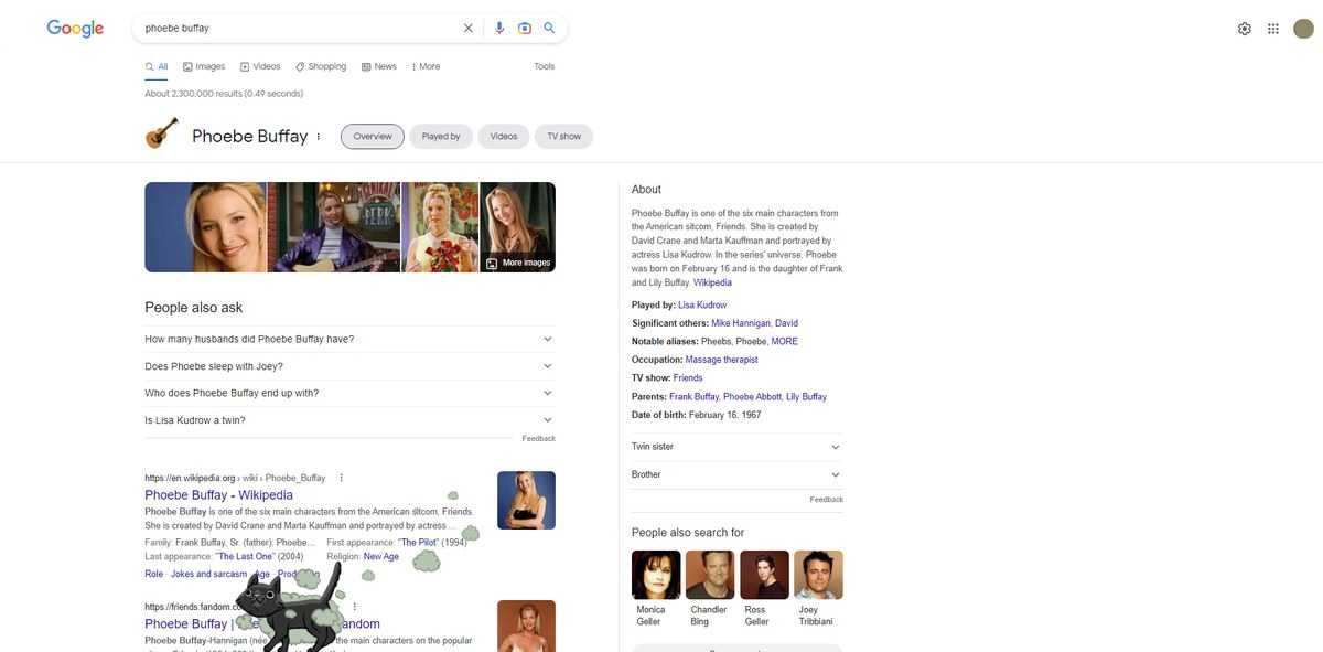 При запросе «Phoebe Buffay» или «Phoebe Friends», например, вы сможете кликнуть на гитару — и получить песенку про вонючего котенка. Вместе с этим самым котенком от иллюстраторов Google, который будет прогуливаться по странице.
