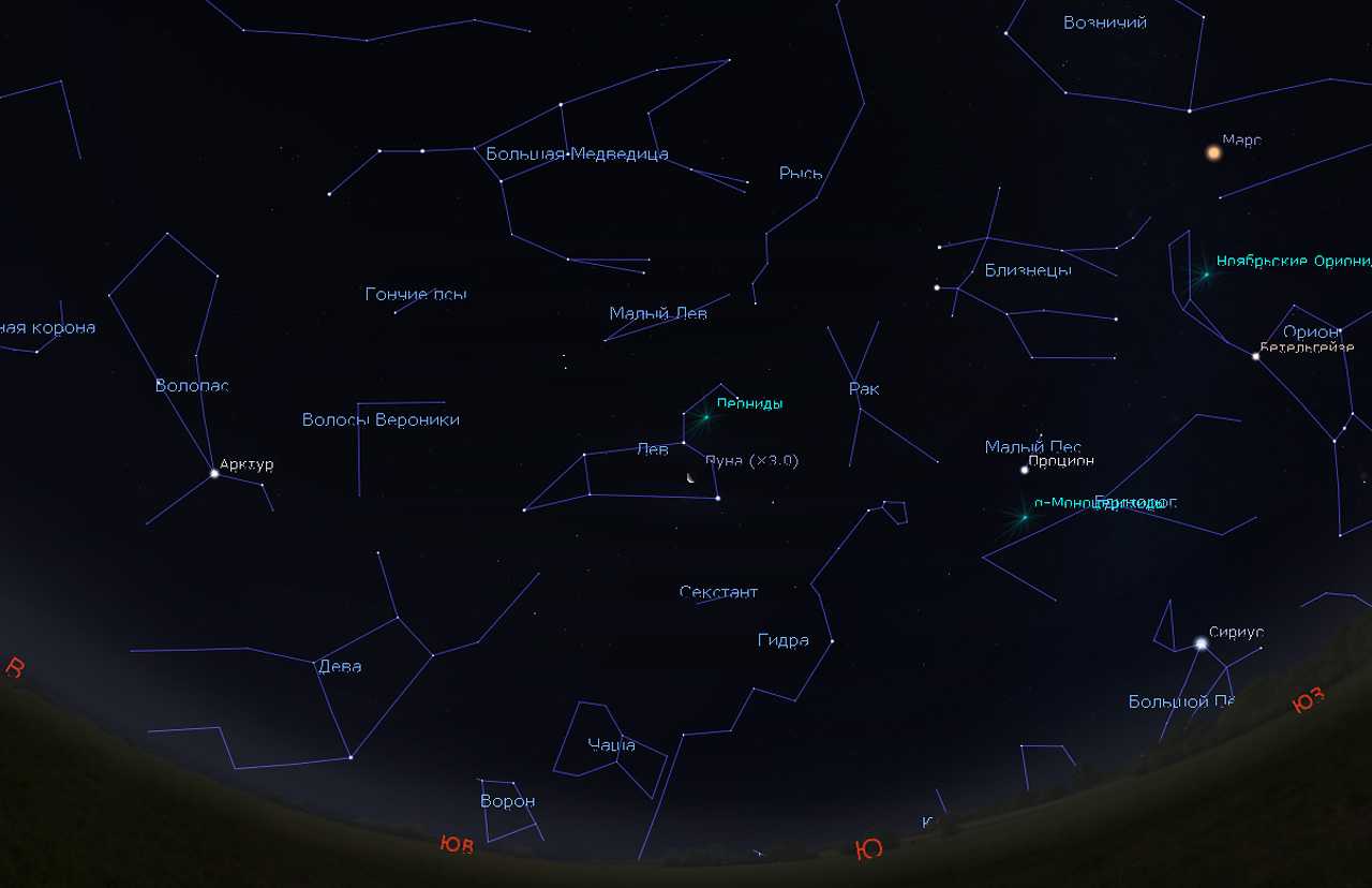 Созвездие Льва на утреннем небе (направление на юг). Во время наблюдения Леонид лучше всего смотреть не на само созвездие, а в сторону — в направлении яркой звезды Арктура на восток, или в направлении Ориона и яркой планеты Марс на запад. Рисунок: Stellarium