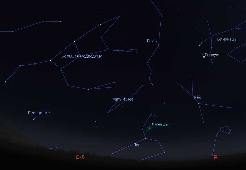 В созвездии Льва находится радиант Леонид (точка на небе, из которой вылетают метеоры). 18 ноября он будет располагаться немного выше Луны, в той части созвездия, которую называют «серпом».