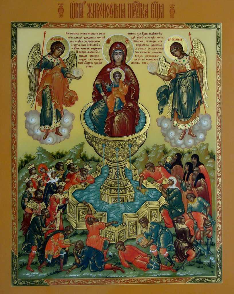 В стихирах дня также можно встретить именование Богородицы «живоприемным источником», ведь Она приняла в Себя Бога, подателя жизни. Иногда таким же образом именуют и почитаемую икону.