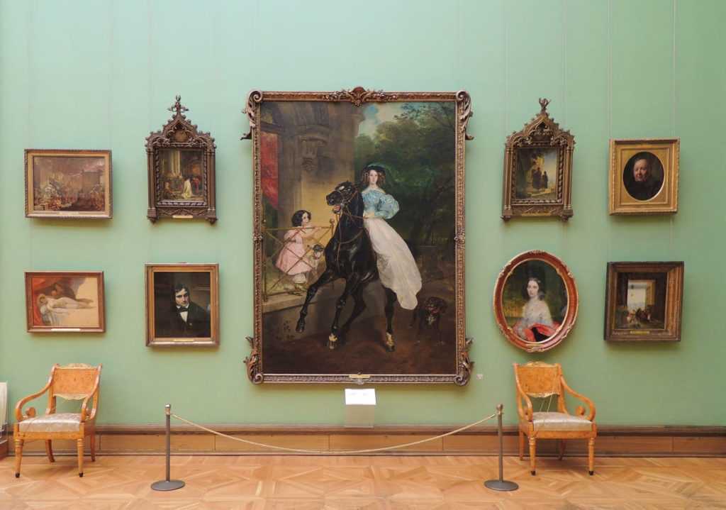 При посещении Третьяковской галереи первым пунктом вашего маршрута может стать «Всадница» Карла Брюллова. Полотно было написано по заказу графини Юлии Самойловой, с которой живописца связывали давние дружеские и романтические отношения. На картине — её воспитанницы Джованнина и Амацилия. Впервые в истории живописи молодая девушка была изображена в стиле парадных портретов военачальников и императоров. До Брюллова никто на такое не осмеливался. Также автор будто бы пренебрегает законами физики. Лошадь, на которой скачет всадница, начинает вставать на дыбы. Лицо и положение тела Джованнины невозмутимы, кудри в её прическе статичны, хотя должны были бы развеваться на ветру. Вероятно, целью художника было передать личные черты всадницы, её гармоничность и спокойствие, а также показать незыблемость красоты в изменчивом мире.