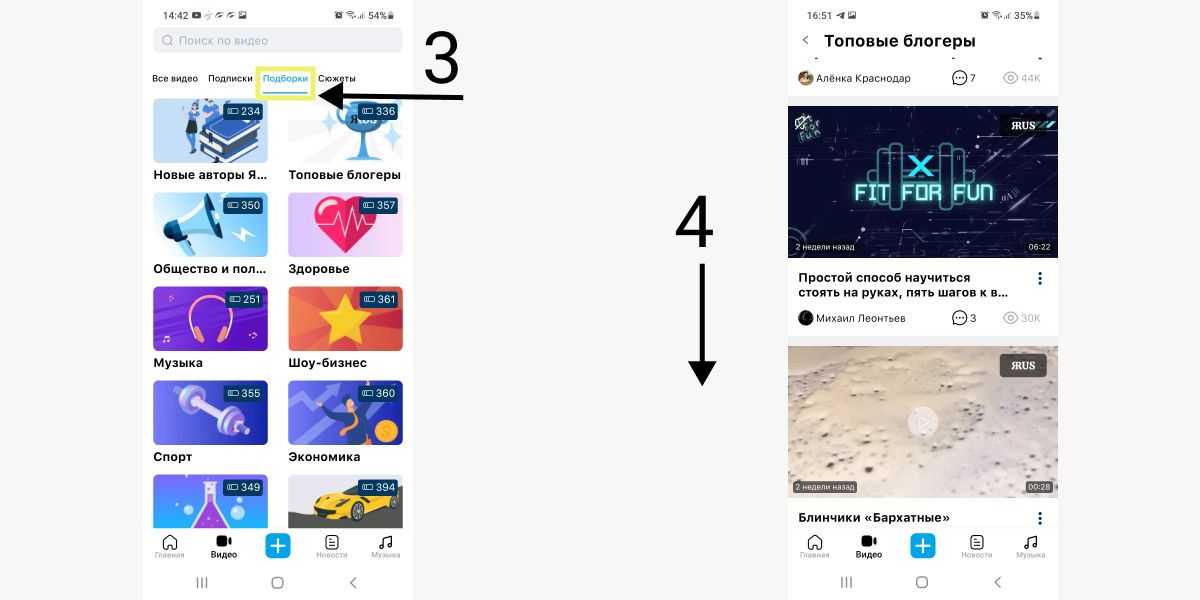 Смахните влево, чтобы перейти на вкладку «Подборки» и посмотреть ролики по категориям.
