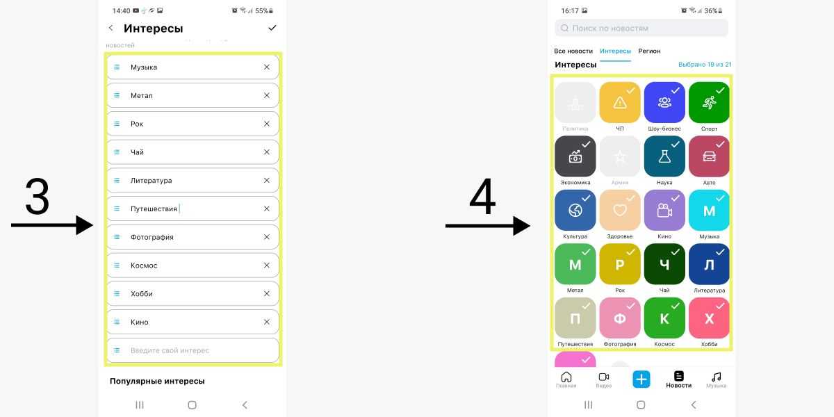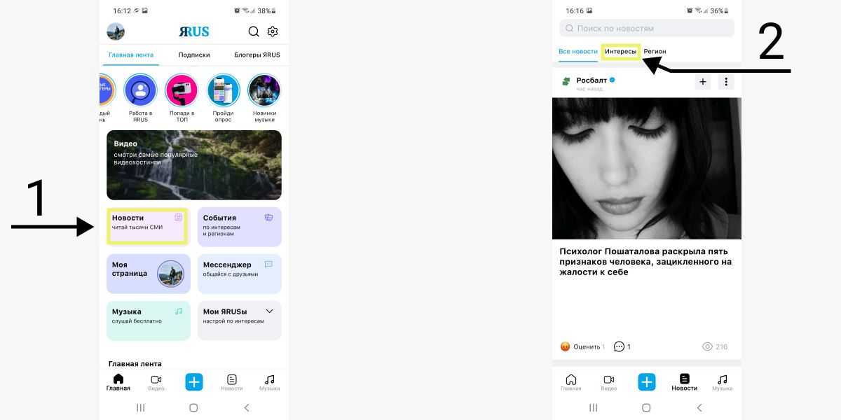На главной странице выберите «Новости», смахните влево в категорию «Интересы», чтобы настроить ленту по своим предпочтениям.