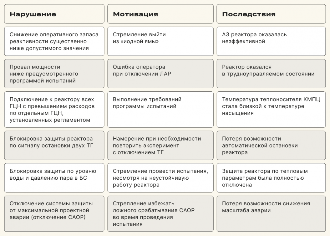 Днём операторы отключили систему аварийного охлаждения реактора — САОР, а во время эксперимента изменили порядок его проведения. И то и другое не было нарушением регламента, но привело к катастрофе.