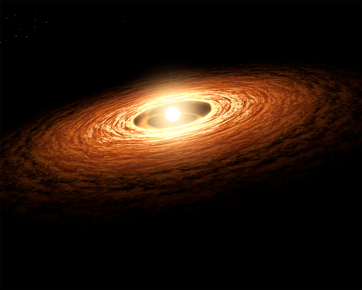 Облако межзвездного вещества, образованное вокруг спонтанно возникшего гравитационного центра, содержало запас тяжелых частиц металлов, которые превращались в пыль, в результате распада звезд предыдущего поколения. Состояние коллапса в новом уплотнении молекулярной среды способствовало появлению в нем начального углового момента. Согласно закону о сохранении в условиях гравитации углового момента, скорость вращения частиц облака возрастала со временем.