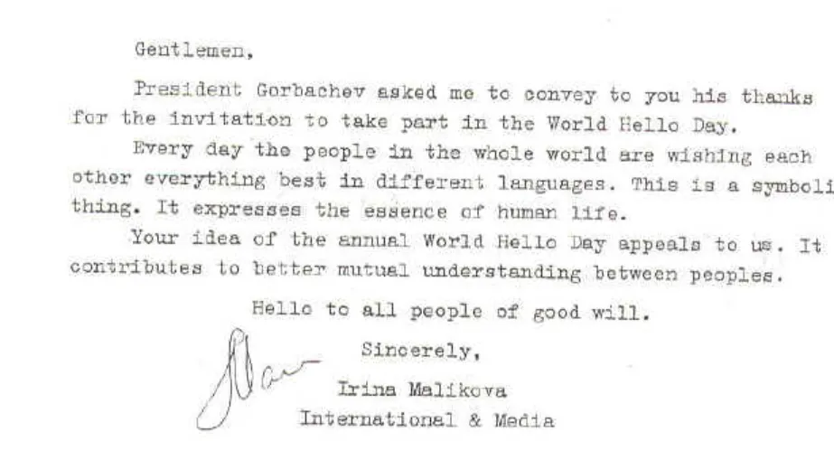 В письме, в котором признается важность Всемирного дня приветствия, Колин Пауэлл, высокопоставленный военный офицер в США в то время, написал, что слово “привет” служит дверью, через которую можно получить доступ к большему взаимопониманию между народами и нациями, поскольку мы продолжаем стремиться к миру во всем мире”