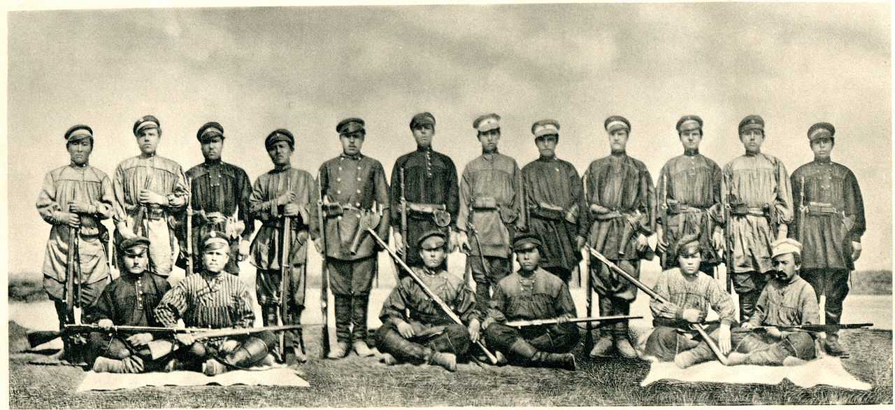 Конвой 4-й экспедиции Н. М. Пржевальского. Сидят (слева направо): Нефедов, Иванов, Перевалов, Соковников, Полуянов, Юсупов. Стоят (слева направо): Иринчинов, Безсонов, Добрынин, Дорджеев, Хлебников, Блинков, Протопопов, Телешов, Родионов, Жарников, Жаркой, Максимов. Фото В. И. Роборовского. Фото: общественное достояние