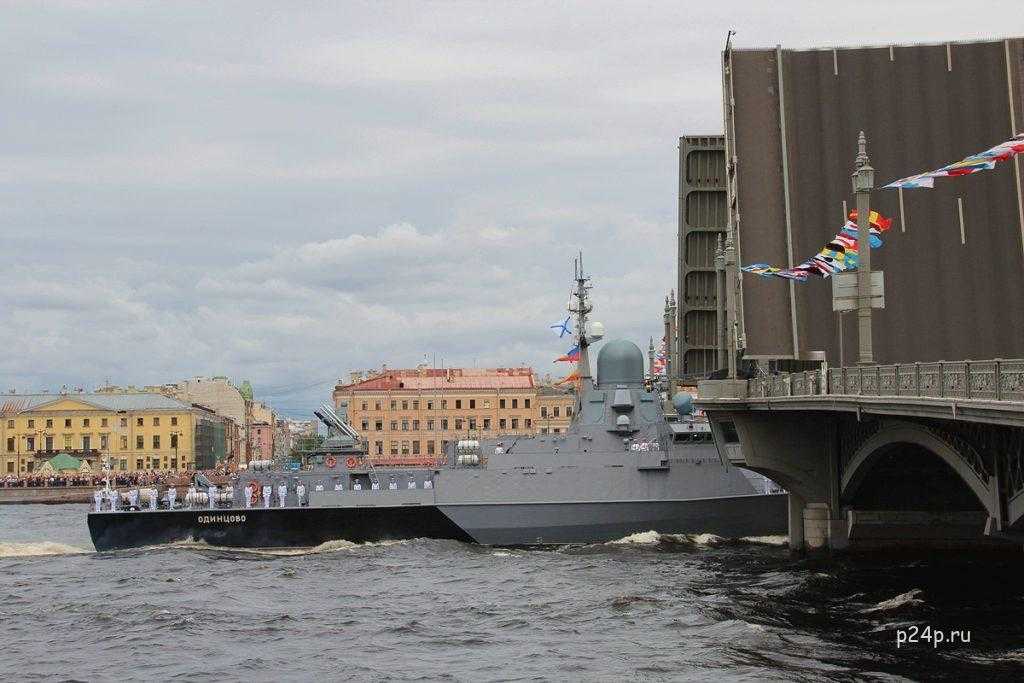 Первый корабль, прибывший в порт Кронштадта перед участием в торжественном мероприятии – малое ракетное судно «Великий Устюг» по проекту 21631, проходящее под шифром «Буян-М» и входящее во флотилию Каспийского флота. Конструкция этого корабля, относящегося к судам класса «река-море», выполнена в соответствии с требованиями к снижению видимости на радиолокационных приборах.