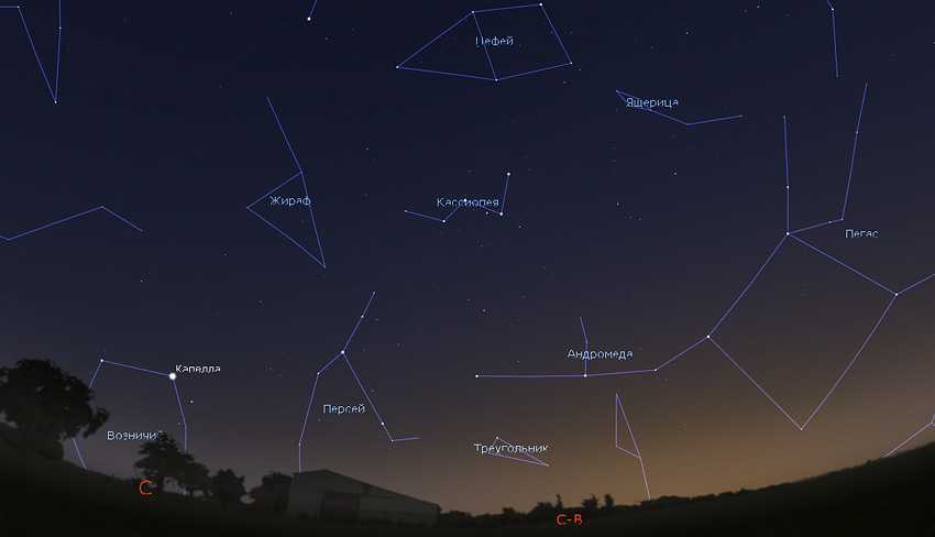 Низко над северным горизонтом стелется созвездие Персея и уже упомянутая звезда Капелла.