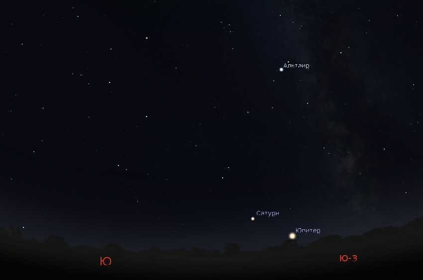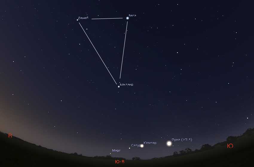 Кстати, в 2020 году над Юпитером и Сатурном находятся три яркие звезды — Альтаир, Вега и Денеб, вместе образующие фигуру Летний треугольник. Вы можете воспользоваться помощью треугольника для нахождения планет в городе. Также при желании вы можете сопоставить блеск этих трех звезд (все они входят в топ-20 ярчайших звезд ночного неба) и планет. Вы тут же убедитесь, насколько ярок Юпитер! Он намного ярче любой из этих трех звезд! Надеюсь, что в будущем представление о блеске Юпитера и Венеры поможет вам отличать их от звезд за секунду.
