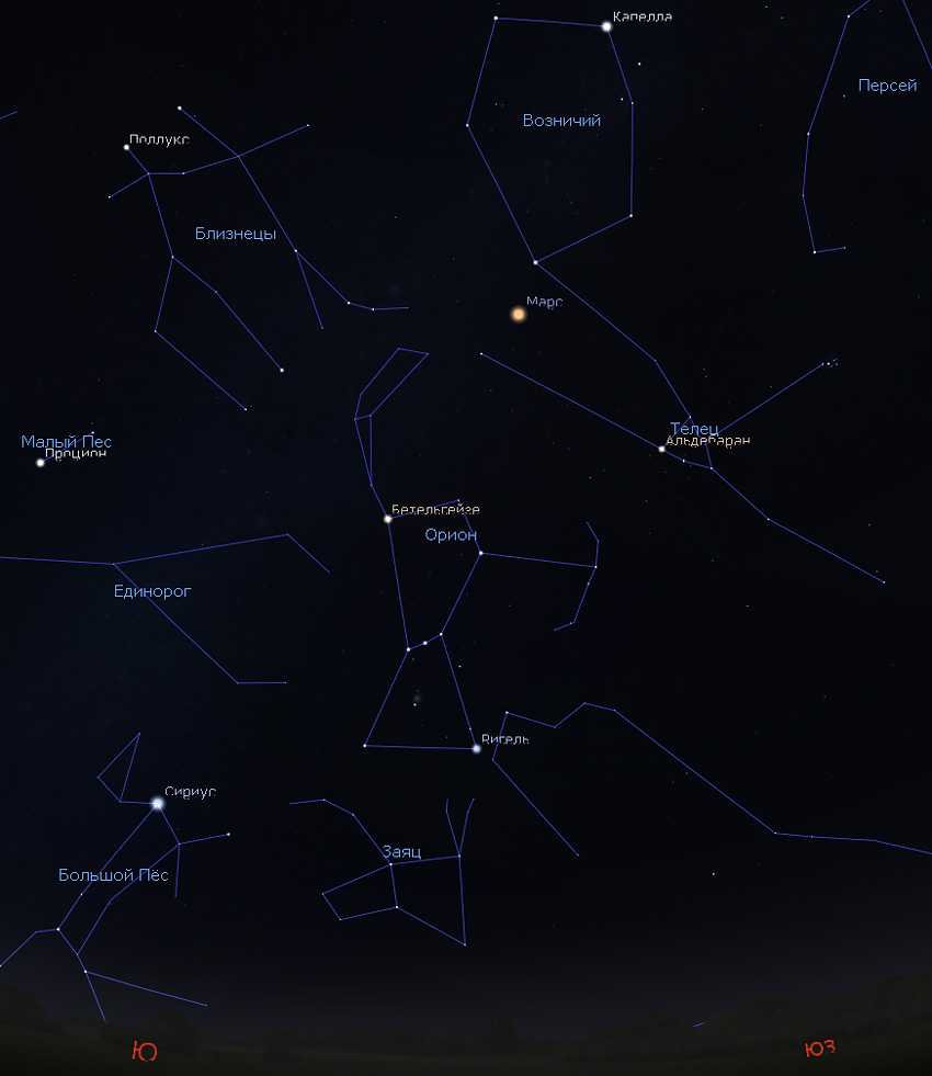 На юге сразу обращает на себя внимание исполинская фигура Ориона, подмигивающая красным гигантом Бетельгейзе. Ниже сверкает Сириус, альфа Большого Пса и самая яркая звезда северного полушария