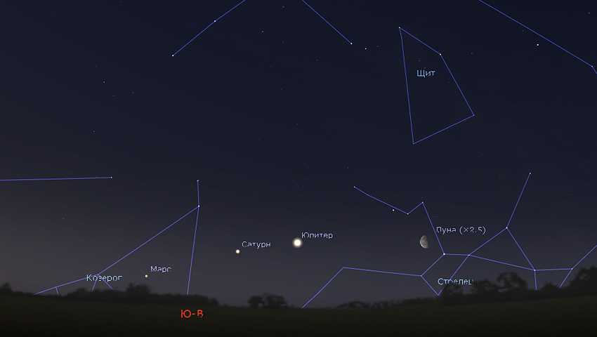 Обратите внимание: в 2020 году под ним находятся планеты Юпитер, Сатурн и Марс. Рисунок: Stellarium