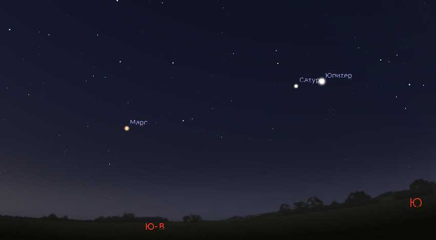 Три планеты — Сатурн, Юпитер и Марс — по-прежнему обращают на себя внимание на вечернем небе. Особенно выделяется Юпитер