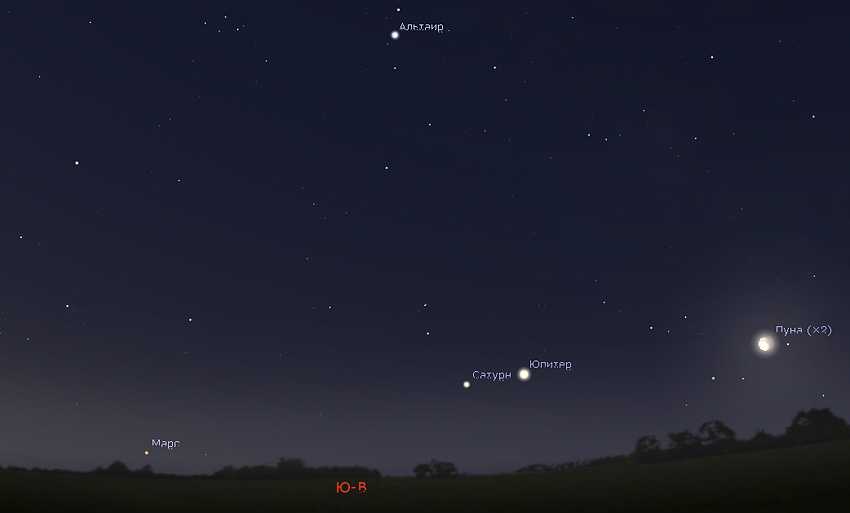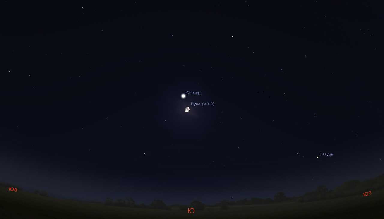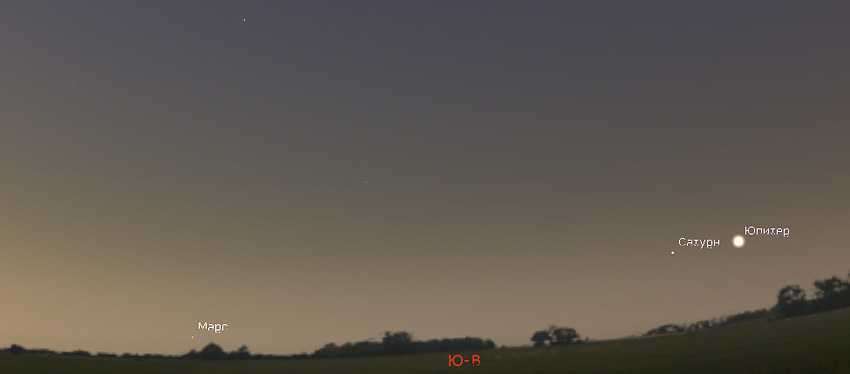 Они располагаются восточнее, т. е. левее Юпитера. Сатурн — примерно в 6°, а угловое расстояние между Юпитером и Марсом в течение апреля увеличивается с 6 до 24 градусов.