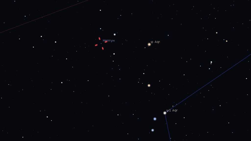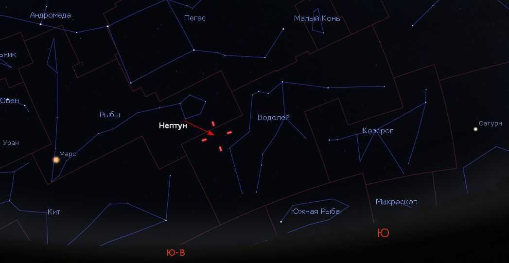Нептун можно найти в созвездии Водолея вечером. Его блеск составит +7.8m. Чтобы различить его диск, нужен довольно мощный телескоп с апертурой от 200 мм.