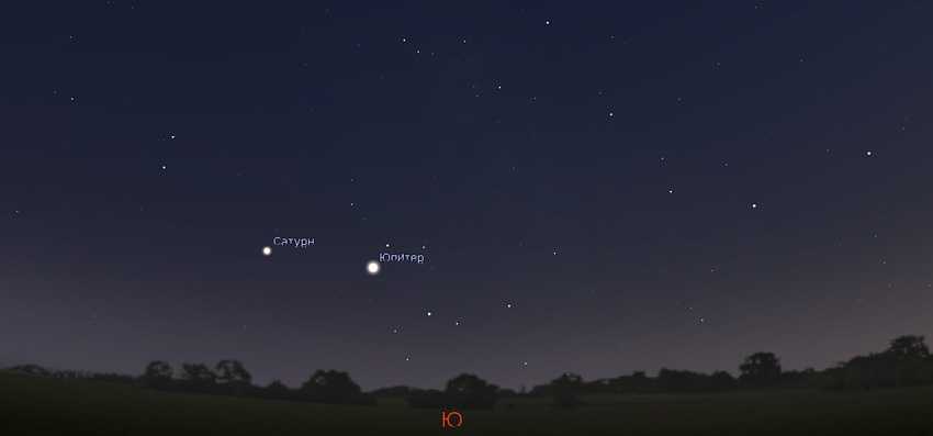 Соединение Юпитера и Сатурна 21 декабря 2020 года. Положение планет вечером.