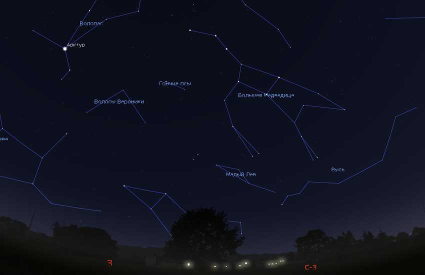 Трапеция Льва, наклонившись, почти касается горизонта на западе. Здесь же располагается Большой Ковш. Он также сильно наклонен: будь в нем вода — пролилась бы на землю!