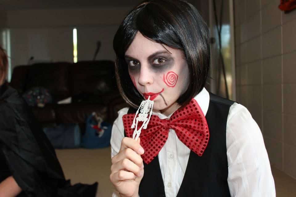 Это еще один устрашающий персонаж. Причем снова эксплуатируется образ куклы. За основу берется персонаж серии фильмов «Пила». Это кукла с маской вместо лица. Также используется вспомогательный атрибут, усиливающий ужас. В данном случае это детский трехколесный велосипед.