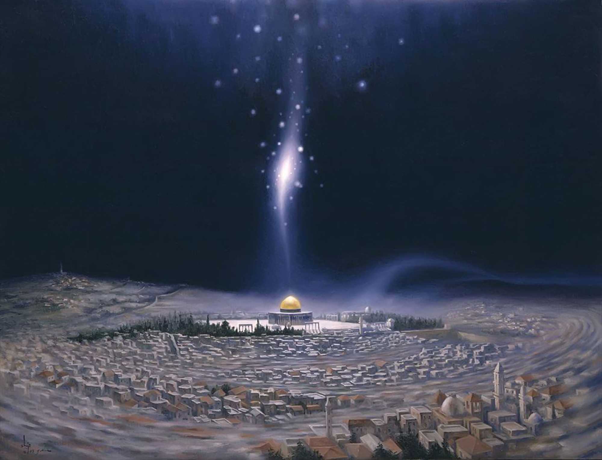 Выйдя из храма, он увидел, как с неба опускается освещенная неземным светом лестница, и мгновенно поднялся по ней к небесам (Мирадж). Он вознесся к семи Небесам – туда, куда не возносился никто из сотворенных. За время Небошествия Пророк, мир ему и благословение, увидел Небесную Каабу, Рай, Ад, ‘Арш и другие знамения. На каждом небе он встречал приветствующих его пророков, а затем говорил с Всевышним Аллахом, и Он был вне времени и места. Увидев все это, Пророк Мухаммад, мир ему и благословение, вернулся в Мекку».