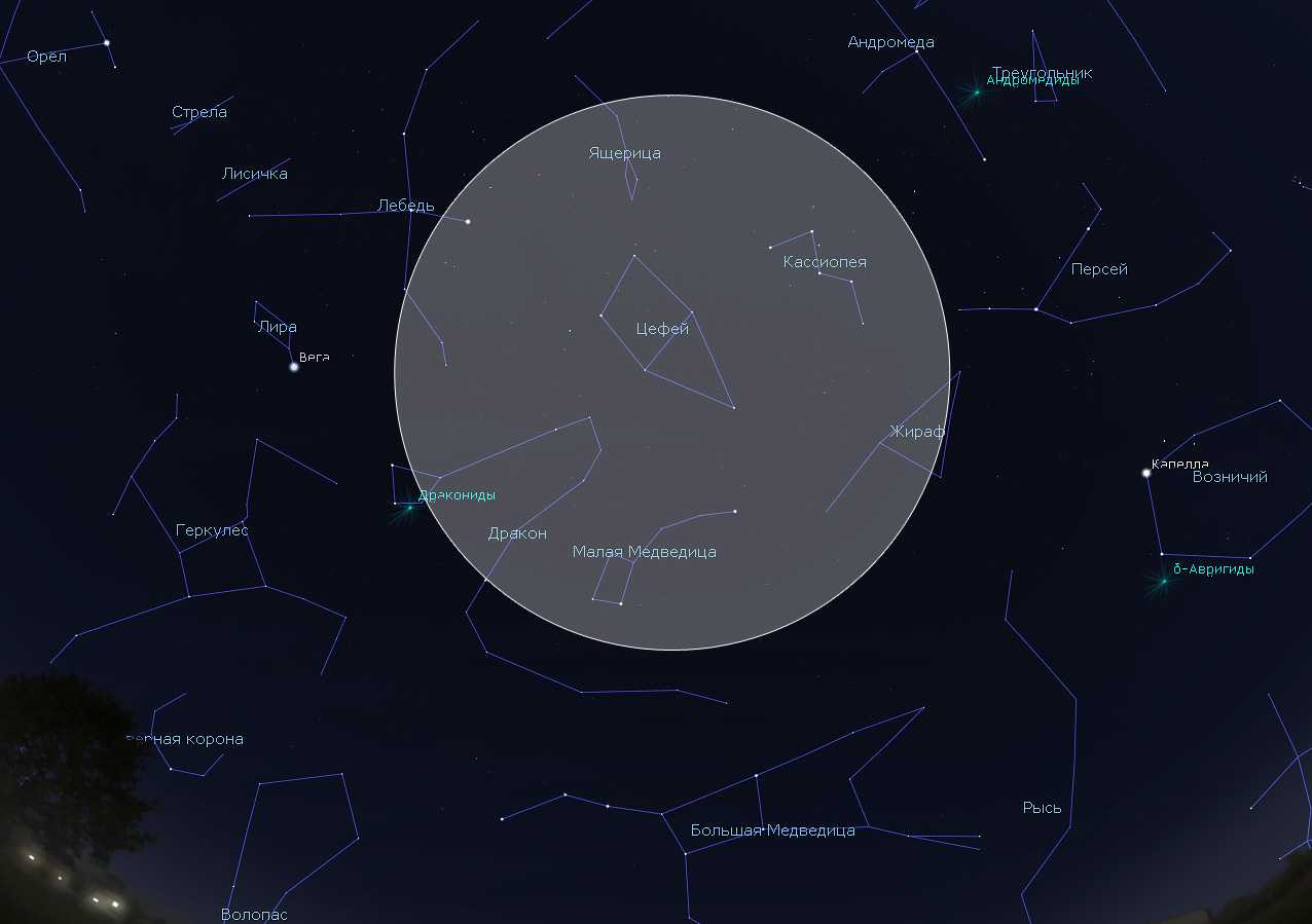 Примерный участок неба, куда желательно смотреть при наблюдении Драконид. (Нажмите на рисунок для увеличения.) Рисунок: Stellarium