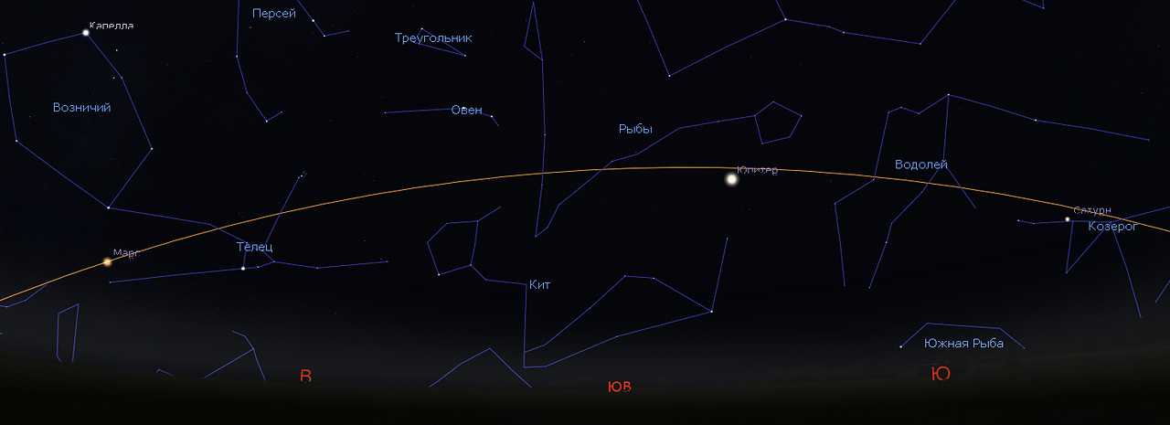 Планеты на вечернем небе в октябре 2022 года. Сатурн находится на юго-западе в созвездии Козерога, Юпитер в созвездии Рыб на юго-востоке, Марс — в Тельце на востоке. Желтая дуга — эклиптика, путь, который совершает Солнце на фоне созвездий в течение года. Рисунок: Stellarium